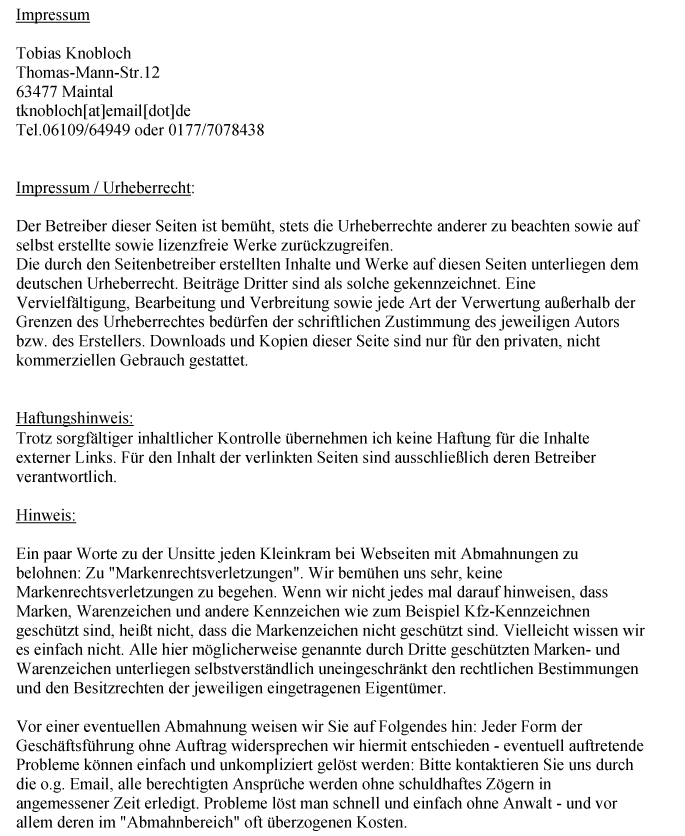 Bei direkten oder indirekten Verweisen auf fremde Webseiten (â€Hyperlinksâ€), die ausserhalb des Verantwortungsbereiches des Autors liegen, wuerde eine Haftungsverpflichtung ausschliesslich in dem Fall in Kraft treten, in dem der Autor von den Inhalten Kenntnis hat und es ihm technisch moeglich und zumutbar waere, die Nutzung im Falle rechtswidriger Inhalte zu verhindern. Der Autor erklaert hiermit ausdruecklich, dass zum Zeitpunkt der Linksetzung keine illegalen Inhalte auf den zu verlinkenden Seiten erkennbar waren. Auf die aktuelle und zukuenftige Gestaltung, die Inhalte oder die Urheberschaft der verlinkten/verknuepften Seiten hat der Autor keinerlei Einfluss. Deshalb distanziert er sich hiermit ausdruecklich von allen Inhalten aller verlinkten /verknuepften Seiten, die nach der Linksetzung veraendert wurden. Diese Feststellung gilt fuer alle innerhalb des eigenen Internetangebotes gesetzten Links und Verweise sowie fuer Fremdeintraege in vom Autor eingerichteten Gaestebuechern, Diskussionsforen, Linkverzeichnissen, Mailinglisten und in allen anderen Formen von Datenbanken, auf deren Inhalt externe Schreibzugriffe moeglich sind. Fuer illegale, fehlerhafte oder unvollstaendige Inhalte und insbesondere fuer Schaeden, die aus der Nutzung oder Nichtnutzung solcherart dargebotener Informationen entstehen, haftet allein der Anbieter der Seite, auf welche verwiesen wurde, nicht derjenige, der ueber Links auf die jeweilige Veroeffentlichung lediglich verweist.